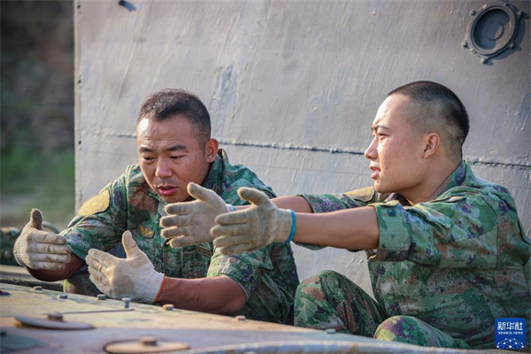 陸軍第71集團(tuán)軍某旅“濟(jì)南英雄連”連長(zhǎng)孫金龍(左)向步戰(zhàn)車(chē)駕駛員請(qǐng)教專(zhuān)業(yè)知識(shí)(2022年9月18日攝)。新華社發(fā)(黃振宇 攝)