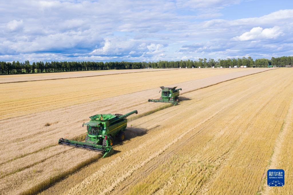 黑龍江北大荒,一臺(tái)臺(tái)收割機(jī)車往來穿梭,豐收的畫卷在這片黑土地鋪展開來。