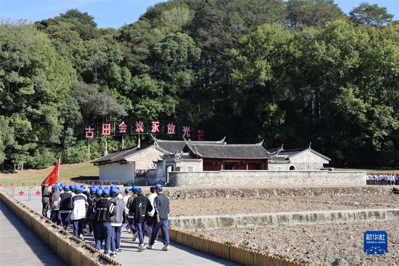 10月19日,在福建省上杭縣古田鎮(zhèn),中學(xué)生研學(xué)團(tuán)隊在古田會議會址參觀學(xué)習(xí)。新華社發(fā)(范道鑫 攝)