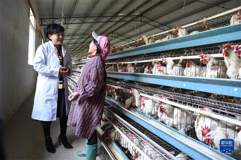 二十大代表余留芬(左)在養(yǎng)殖場(chǎng)內(nèi)與工作人員交談(2017年10月29日攝)。新華社記者 歐東衢 攝