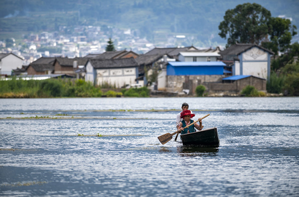 9月28日,洱源西湖當?shù)卮迕駝澊鲂?。新華社記者 陳欣波 攝