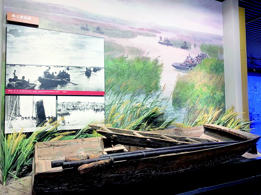 跟隨任京培的步伐,記者看到了紀(jì)念館中陳列的一艘長約三四米的木船,上面被日軍射擊的累累彈痕印證著歷史。在船上,還有兩把近3米的大抬杠槍。任京培說,這是一種當(dāng)?shù)孬C人發(fā)明的武器,槍筒又長又粗,不但打得遠(yuǎn),而且火力足威力大。