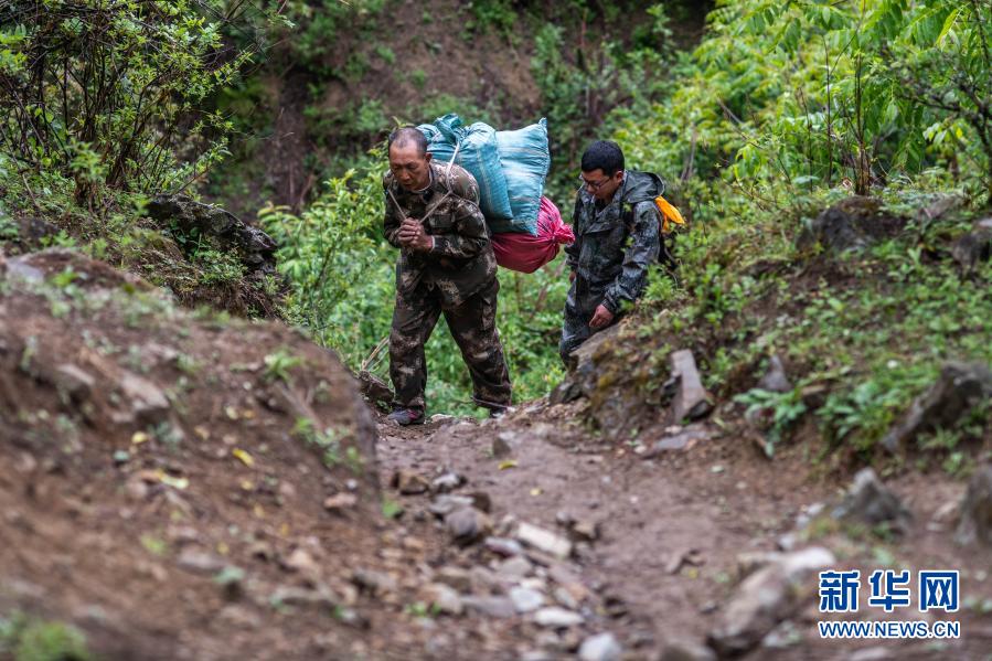 在云南省迪慶藏族自治州香格里拉滇金絲猴國家公園,護猴員余小德(左)背著喂滇金絲猴的食物上山(2020年5月23日攝)。新華社記者 胡超 攝