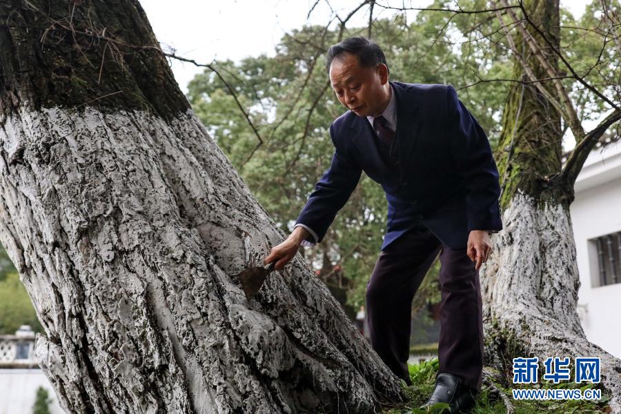1月27日,67歲的“樹醫(yī)生”張本光在養(yǎng)護遵義會議會址前的槐樹。新華社記者 歐東衢 攝