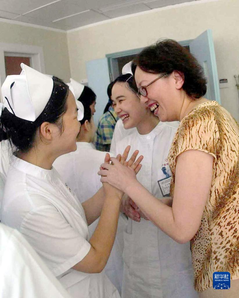 2003年7月2日,廣州醫(yī)學(xué)院第一附屬醫(yī)院最后出院的3名“非典”患者之一(右一)向白衣天使們表示感謝。新華社記者 陳學(xué)思 攝