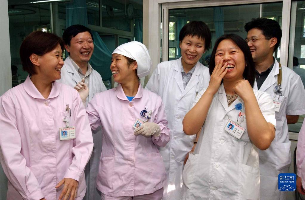 2003年6月24日,北京大學(xué)第一醫(yī)院呼吸科重癥監(jiān)護(hù)病房的醫(yī)護(hù)人員聽(tīng)到世衛(wèi)組織對(duì)北京“雙解除”的消息后,露出勝利的笑容。當(dāng)日,世界衛(wèi)生組織取消對(duì)北京地區(qū)的旅行警告,同時(shí)將北京從有疫情傳播地區(qū)的名單上去除。新華社記者 王呈選 攝