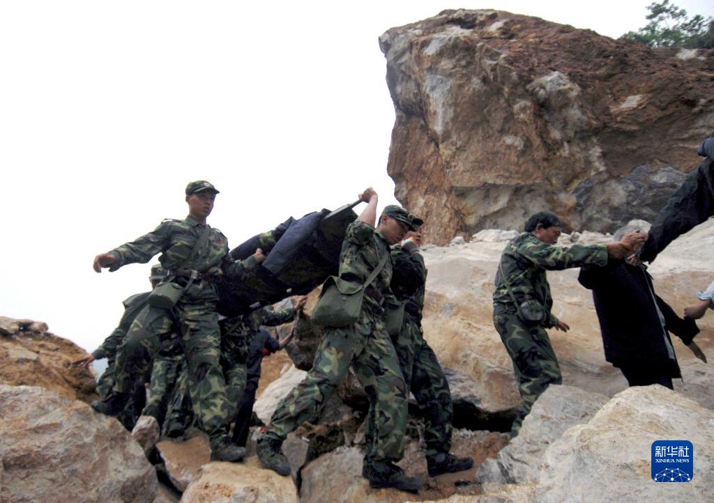 在四川省北川縣災(zāi)區(qū),武警戰(zhàn)士在救援受傷者(2008年5月13日攝)。新華社記者陳燮攝