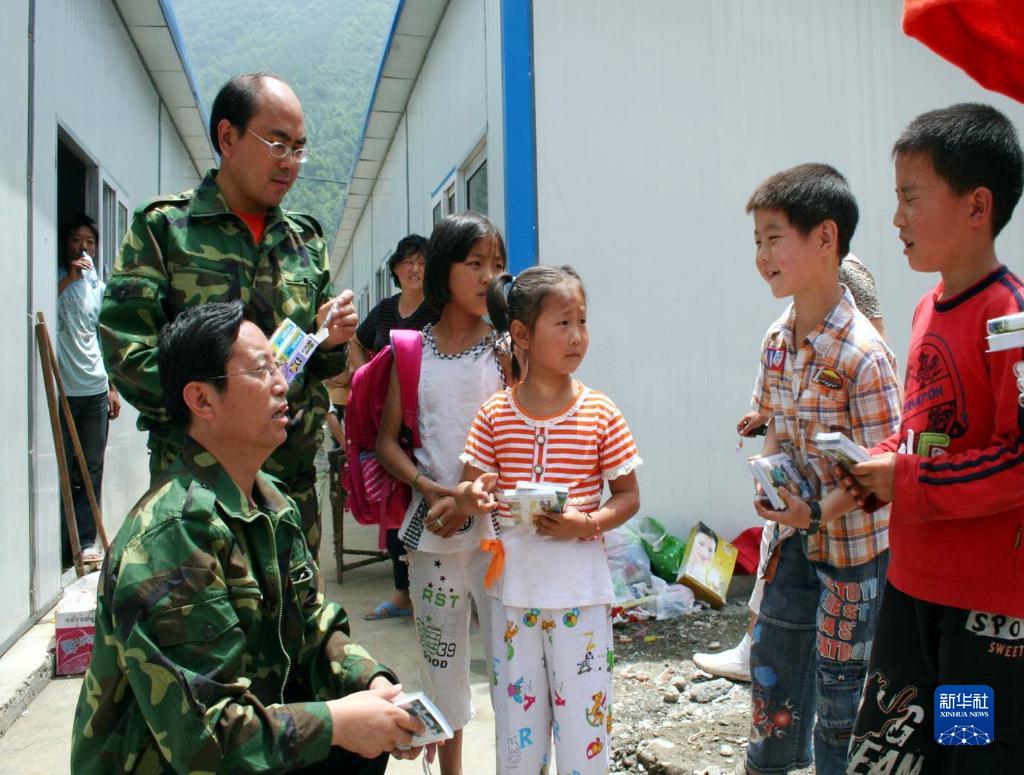 2008年“六一”兒童節(jié)當(dāng)天,援川干部崔學(xué)選(前左)在北川縣桂溪鄉(xiāng)看望受災(zāi)兒童。新華社發(fā)