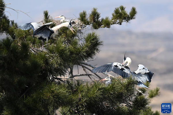 2021年3月11日,在位于呂梁山深處的山西省呂梁市方山縣積翠鄉(xiāng),蒼鷺在林間嬉戲。新華社發(fā)(劉亮亮 攝)