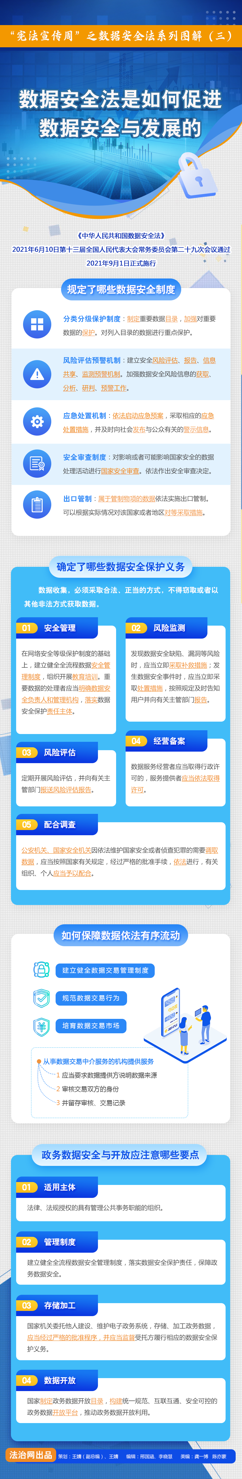 值此第四個“憲法宣傳周”之際,法治網(wǎng)將為您解讀今年9月1日起施行的《中華人民共和國數(shù)據(jù)安全法》——這部法律的亮點是什么?它是如何支持促進數(shù)據(jù)安全與發(fā)展的?它又彰顯了哪些數(shù)據(jù)“溫度”?這一系列問題,都會在法治網(wǎng)《數(shù)據(jù)安全法圖解(系列)》中找到答案。