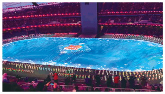 圖為在開幕式預熱環(huán)節(jié),一個“?!弊滞渡涞綀龅刂醒?。法治日報全媒體見習記者 劉欣 攝