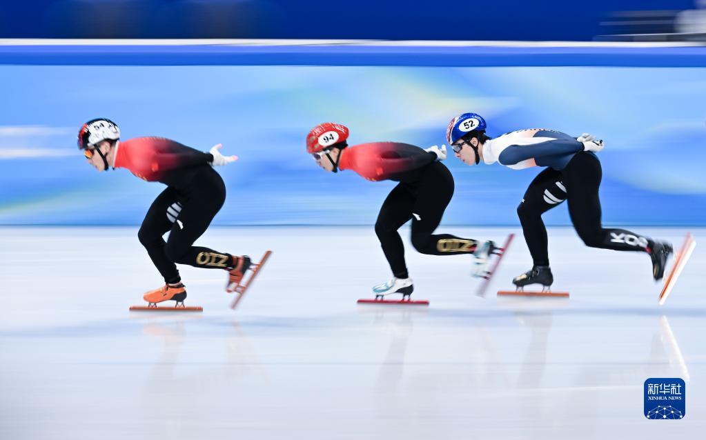 2月7日,中國選手任子威(左)、李文龍(中),韓國選手黃大憲(右)在比賽中。新華社記者李尕攝