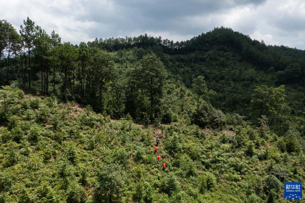 在浙江省杭州市臨安區(qū)太湖源鎮(zhèn)上陽村重陽塢,志愿者在“碳中和林”進行日常巡查(2021年7月20日攝,無人機照片)。新華社記者 徐昱 攝