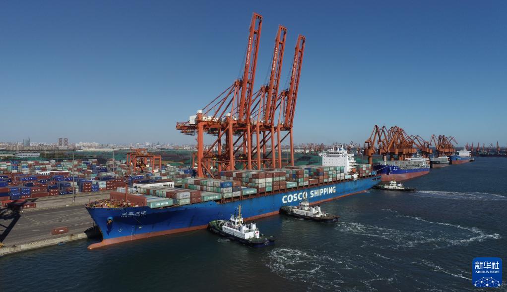一艘輪船在拖輪的協(xié)助下向唐山港京唐港區(qū)集裝箱碼頭靠泊(2021年10月23日攝,無人機照片)。新華社記者 朱旭東 攝