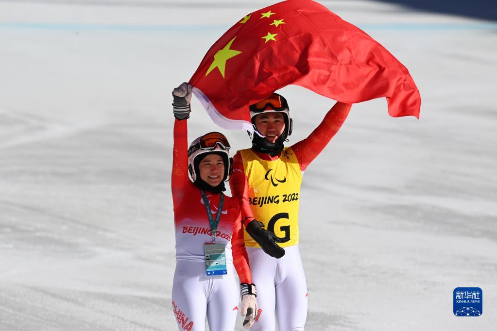 3月5日,中國(guó)選手朱大慶(左)和引導(dǎo)員閆寒寒在北京2022年冬殘奧會(huì)殘奧高山滑雪項(xiàng)目女子滑降(視障)賽后慶祝。新華社記者江漢攝