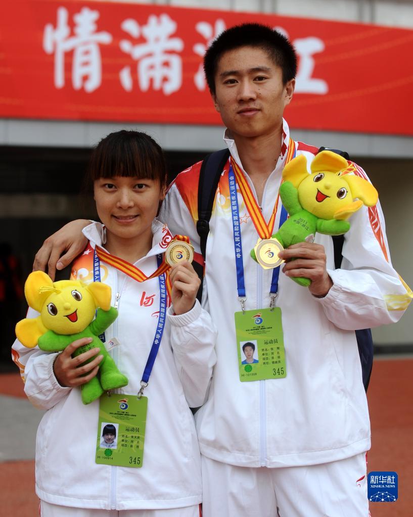 2011年10月14日,在第八屆全國(guó)殘運(yùn)會(huì)上河北隊(duì)選手朱大慶(左)和引導(dǎo)員張輝分享勝利的喜悅。新華社記者燕雁攝