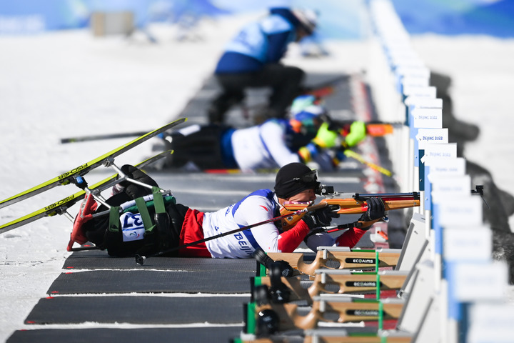 3月5日,中國選手劉子旭奪得北京冬殘奧會(huì)殘奧冬季兩項(xiàng)男子短距離(坐姿)比賽冠軍。新華社記者彭子洋攝