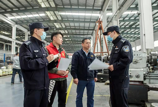 浙江省武義縣公安局熟溪派出所組建“紅風(fēng)箏”助企服務(wù)驛站,切實(shí)為轄區(qū)企業(yè)做好外來(lái)人口服務(wù)管理工作,及時(shí)排查化解企業(yè)員工間的矛盾糾紛,組織平安志愿者開(kāi)展護(hù)企巡邏,為企業(yè)發(fā)展提供良好治安環(huán)境。圖為民警走訪企業(yè)了解治安情況。 徐文榮 攝