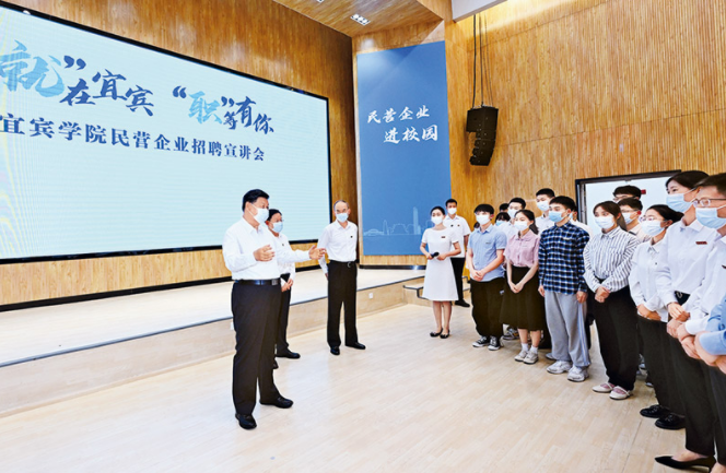 2022年6月8日,中共中央總書記、國(guó)家主席、中央軍委主席習(xí)近平在四川考察。這是8日下午,習(xí)近平在宜賓學(xué)院考察時(shí),向正在參加企業(yè)招聘宣講會(huì)的教師、學(xué)生、企業(yè)負(fù)責(zé)人了解企業(yè)招工需求和畢業(yè)生簽約率等情況。 新華社記者 李學(xué)仁/攝