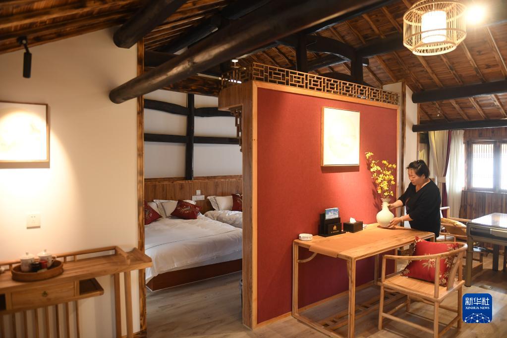 服務(wù)員在浙江省磐安縣烏石村一家民宿內(nèi)整理房間(2019年4月24日攝)。新華社記者 翁忻旸 攝