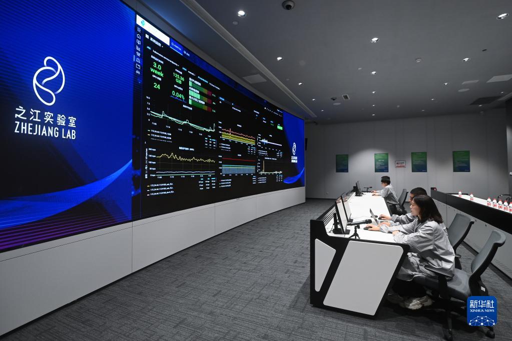 在之江實驗室計算與數(shù)據(jù)中心,工程師們通過“之江云”系統(tǒng)監(jiān)測服務(wù)器集群的運行狀態(tài)(2022年6月23日攝)。新華社記者 黃宗治 攝