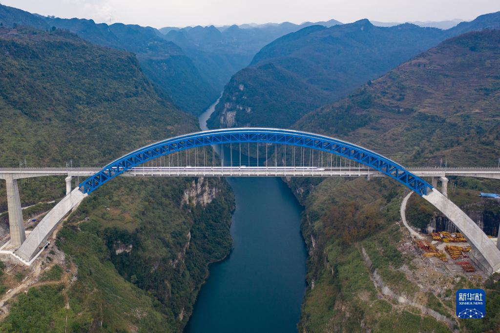 動車組列車駛過成貴高鐵鴨池河特大橋(2019年12月2日攝,無人機(jī)照片)。新華社記者 劉續(xù) 攝