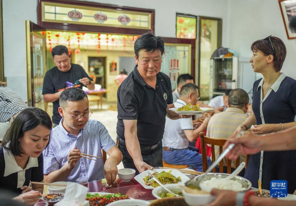 貴州省遵義市播州區(qū)楓香鎮(zhèn)花茂村村民王治強(qiáng)為到農(nóng)家樂就餐的游客上菜(2022年6月28日攝)。新華社記者 陶亮 攝