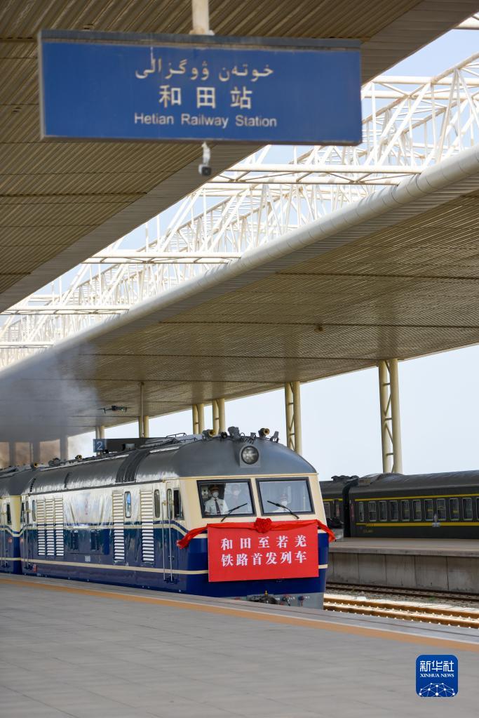 和田至若羌鐵路首趟列車駛出新疆和田火車站(2022年6月16日攝)。新華社記者 丁磊 攝