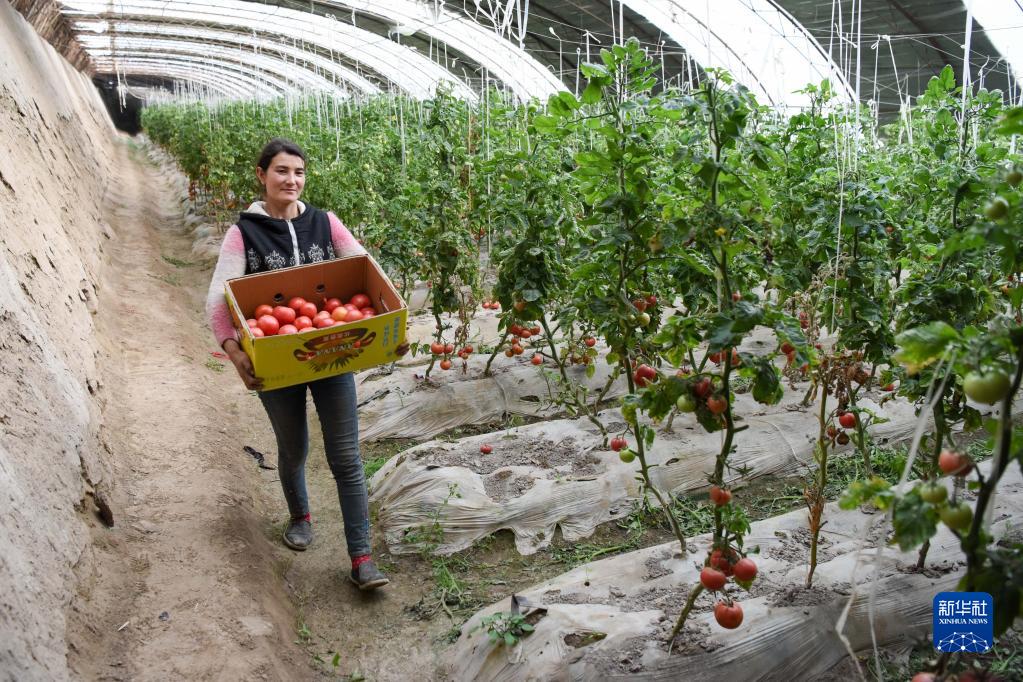 在新疆莎車縣伊什庫力鄉(xiāng)設施農(nóng)業(yè)基地,種植戶搬運剛采摘的西紅柿(2020年3月18日攝)。該設施農(nóng)業(yè)基地是在上海援疆莎車分指揮部協(xié)調(diào)推動下建立的。新華社記者 丁磊 攝