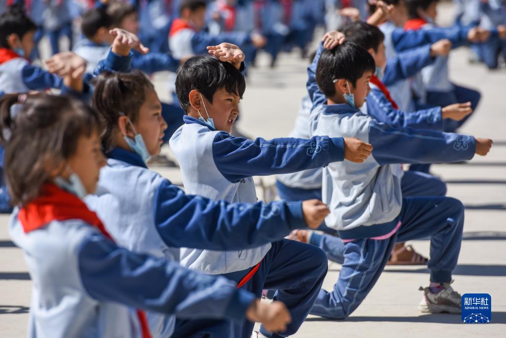 在新疆阿克蘇地區(qū)烏什縣依麻木鎮(zhèn)國家通用語言小學,學生們在做課間操(2022年6月8日攝)。新華社記者 丁磊 攝