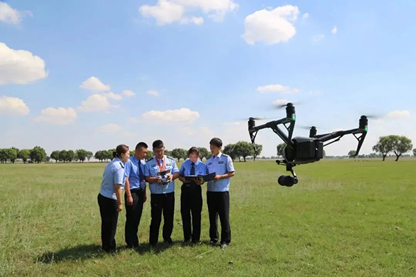 內(nèi)蒙古自治區(qū)鄂爾多斯市鄂托克前旗檢察院聚焦“馬蘭衛(wèi)士·綠色先鋒”公益訴訟品牌,全力打造鄂托克前旗生態(tài)保護檢察名片。圖為2020年8月,該院干警使用無人機巡查草原生態(tài)保護情況。 辛美娜 攝