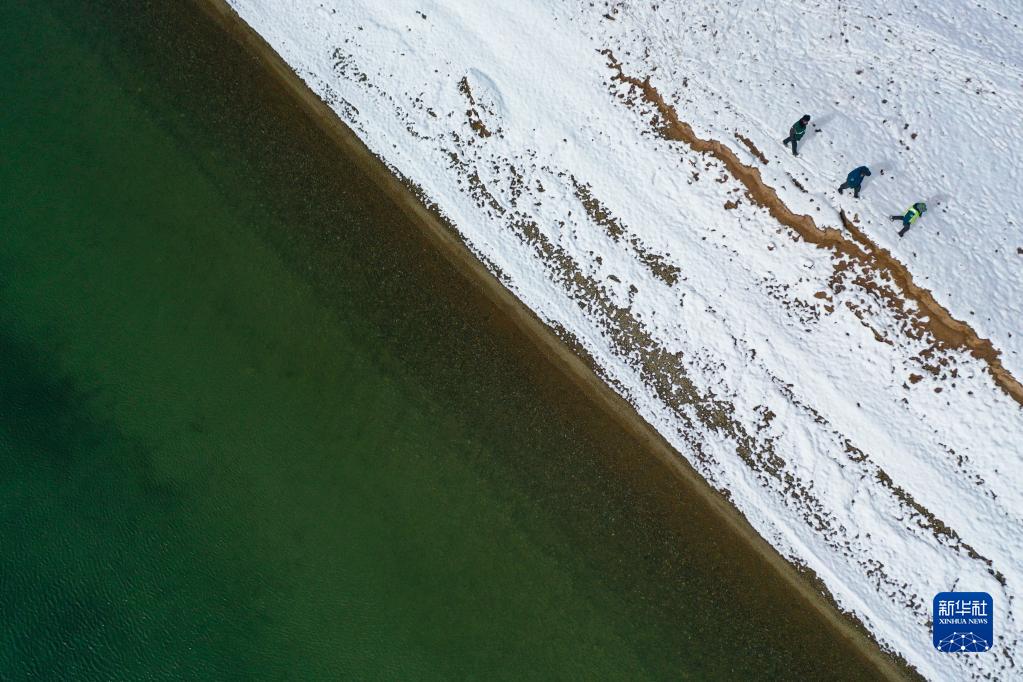在青海省果洛藏族自治州瑪多縣扎陵湖鄉(xiāng)勒那村,三江源國家公園黃河源園區(qū)生態(tài)管護(hù)員在巡護(hù)(2021年10月20日攝,無人機(jī)照片)。 新華社記者 張龍 攝