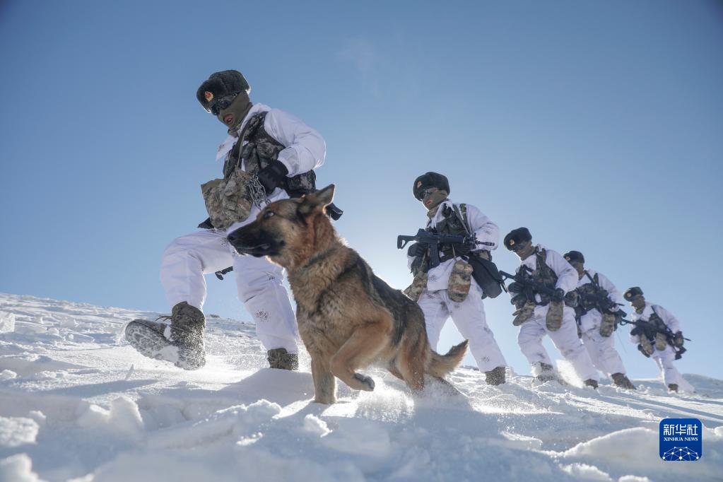 駐守帕米爾高原的新疆喀什軍分區(qū)某邊防團托克滿蘇邊防連官兵按計劃對海拔5100米的山口實施例行巡邏(2021年2月11日攝)。新華社發(fā)(姬文志 攝)