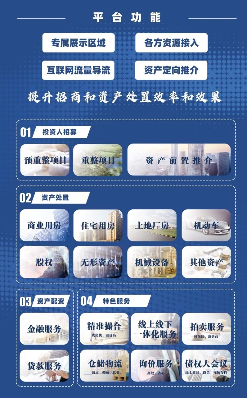 而在特色服務(wù)模塊,借助京東拍賣數(shù)字化、技術(shù)研發(fā)、線上流量、倉儲物流、金融資源等優(yōu)勢,該信息平臺還可為常州市破產(chǎn)企業(yè)提供精準(zhǔn)撮合、線上線下一體化服務(wù)、拍賣服務(wù)、詢價服務(wù)、倉儲物流、債權(quán)人會議等一站式服務(wù),精準(zhǔn)篩選、深度匹配、定向觸達(dá)目標(biāo)用戶,以精準(zhǔn)推介的方式定期對常州優(yōu)質(zhì)項(xiàng)目進(jìn)行投資人定向引流,提升曝光度,為投資人尋找優(yōu)質(zhì)資產(chǎn),為處置方鎖定潛在買家,促進(jìn)資產(chǎn)處置和重整招商的成功率和溢價率,幫助法院及破產(chǎn)企業(yè)實(shí)現(xiàn)資產(chǎn)高效處置,以一系列優(yōu)質(zhì)服務(wù),助力資產(chǎn)處置提質(zhì)增效,為處置雙方保駕護(hù)航。